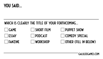 A more contemporary, similar take on this adds the phrase "thanks for coming to my TED talk" to the end of an opinion or hot take. For me, this game originated in conversations with other game designers, and I've been talking about making cards that say "...and that's your next game" as a response to the spoken phrase. And this version is our own evolution.