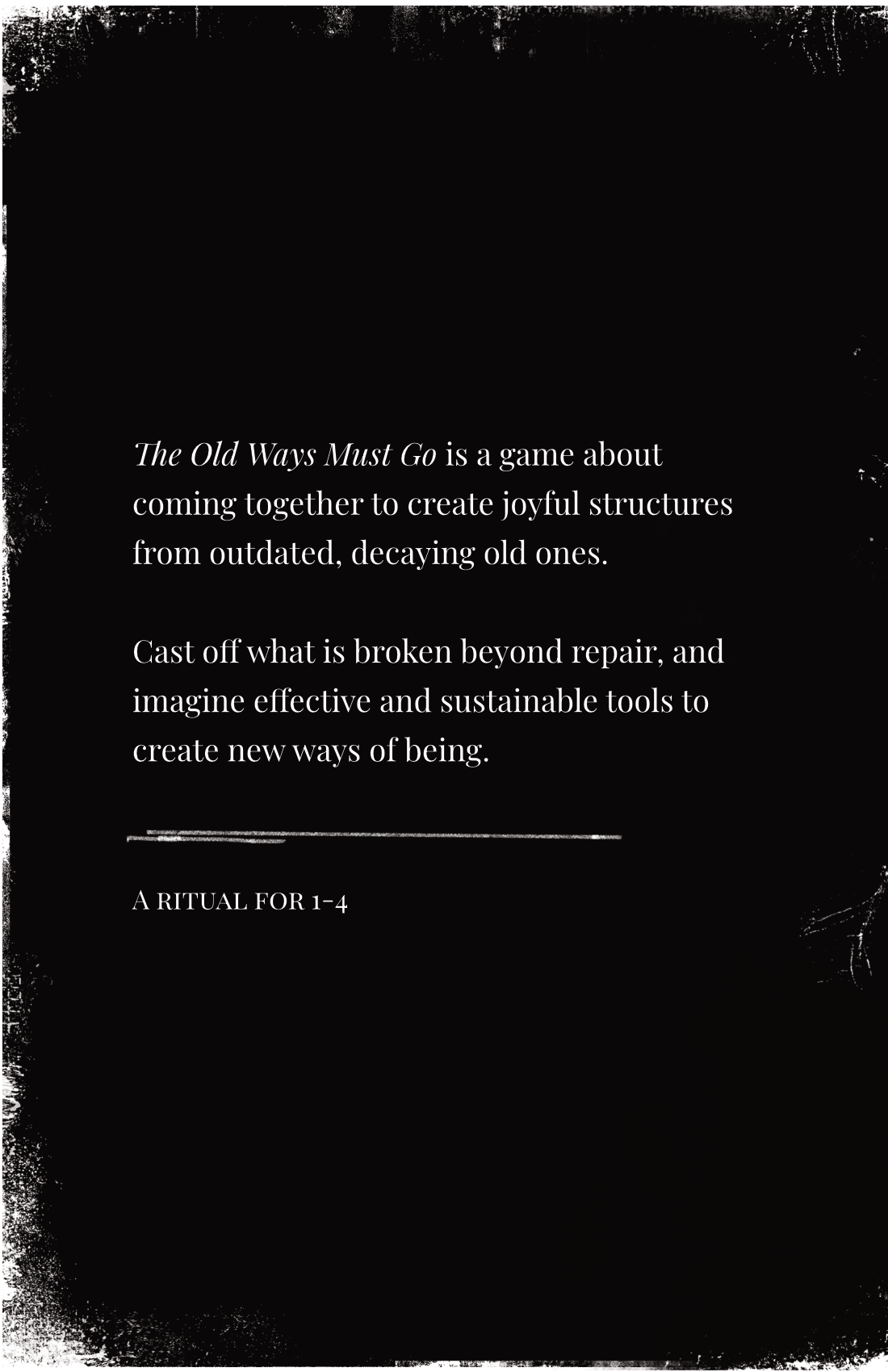 The Old Ways Must Go is a co-operative story telling game about coming together to create new ideas, frameworks, or rituals from outdated, decaying old ones. Its structure offers a framework for creating new rituals and for guiding gentle conversations for healing and moving forward in times of community upheaval. And we've found it offers an intuitive technique for building or deepening your relationship with your favorite tarot or oracle deck.